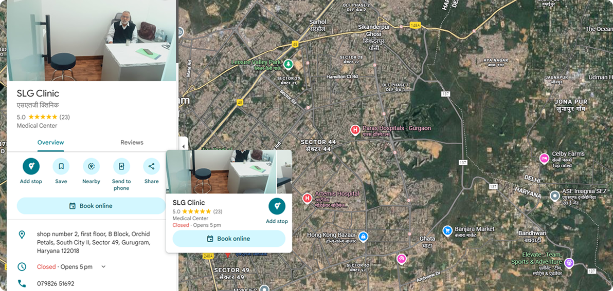 Our clinic is easily accessible from Sohna Road, South City II, Orchid Petals, Nirvana Country, and Sector 49/50.